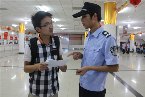 翰林食堂一楼内,护校队的队员们正耐心地引导新生报名,维护报到现场的秩序。“今天来报到的新生很多,队伍很长,秩序维护起来有一定的难度,但我们都很用心。”身穿蓝色制服来自2013级英语本科1班的李志青说。翰林食堂一楼的报到处六位护校队队员一直穿梭在人群中,为新生讲解报到流程、答疑解难。工作中,护校队捡到了一张银行卡,把它交给了学生会失物招领处,力求尽快找到失主。“我现在为学弟学妹提供帮助,明年他们也会向我一样,给他们的学弟学妹提供更好的服务,这是一种传递。”李志青笑着告诉记者。