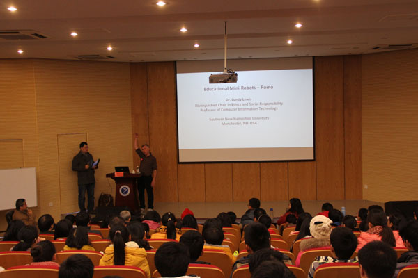 本网讯(王德成 学生记者:詹红 宛琼 马闵 高斯研 金典 )12月18、19日,受我校国际交流与合作中心邀请,美国南新罕布什尔大学Lundy Lewis教授来我校作题为《教育性迷你机器人应用》、《美国青年教师的职业生涯发展路径》的学术报告。并参与了一场关于《如何培养学生伦理道德和社会责任感》的座谈会。我校相关领导及教师、学生聆听了报告。