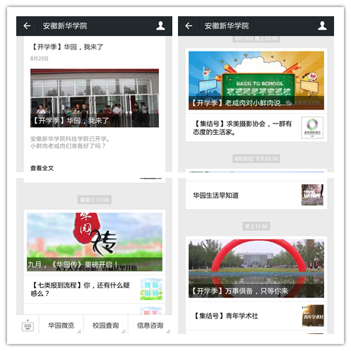 开学前期,安徽新华学院微信平台为帮助新生了解学校各二级学院的情况,还特意推出了“教授带你逛学院”专题,配合校园社团迎新活动推出了“社团集结号”专题。