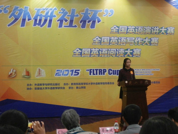 本次大赛由外语与教学研究出版社主办,教育部高等学校大学外语教学指导委员会、教育部高等学校英语专业教学指导分委员会合办,安徽省大学外语教学研究会协办,黄山学院承办,是全国规模最大、历史最长、最具权威性的英语演讲赛事。来自全省各高校的160余名优秀选手参加了比赛。比赛设置了定题演讲与即兴演讲、辩论赛环节。在定题演讲、现场问答、即兴演讲等环节中,我校两位同学凭借生动的演讲、机智的反应、出色的语言表达给评委及现场的观众留下了深刻的印象,为新华学院争得了荣誉。