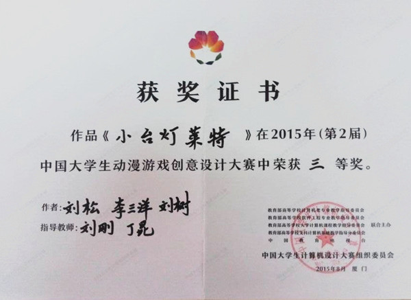 本网讯(通讯员:刘刚)近日,第二届中国大学生动漫游戏创意设计大赛传来喜讯,由我校动漫学院刘刚、丁昆老师指导,2012级学生刘松、李三洋、刘树三人完成的作品《小台灯莱特》获得全国三等奖。这是动漫学院今年在学科专业竞赛中取得的又一项全国性奖项。