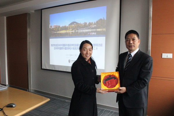 双方首先在国际教育学院会议室进行了座谈,座谈会由程宏云主持。会上,王丽首先代表我校向来宾表示热烈欢迎,并介绍了我校的基本情况。邵玲介绍了学校日语系相关办学情况,双方就实践教学与合作等问题展开了深入的讨论并交换了意见。最后,王丽代表我校赠予日方学校礼品。