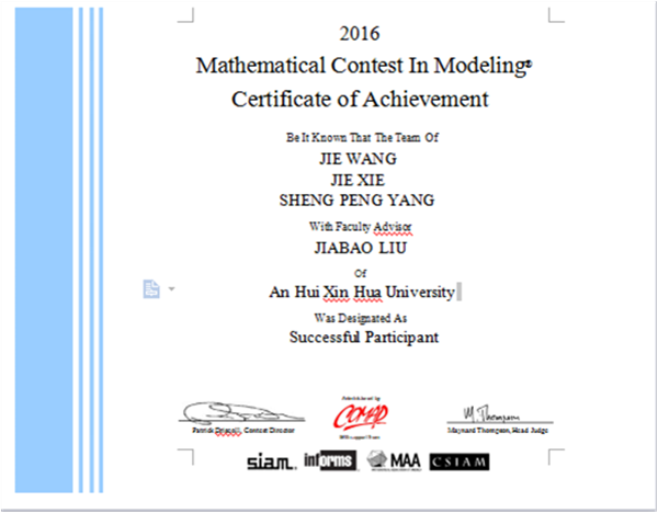 我校获2016年美国(国际)大学生数学建模竞赛三等奖