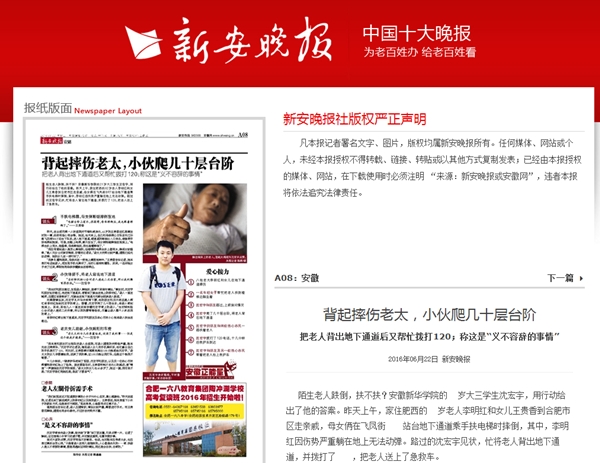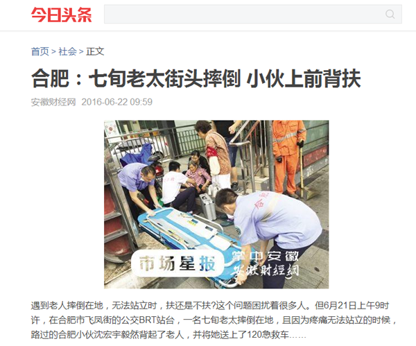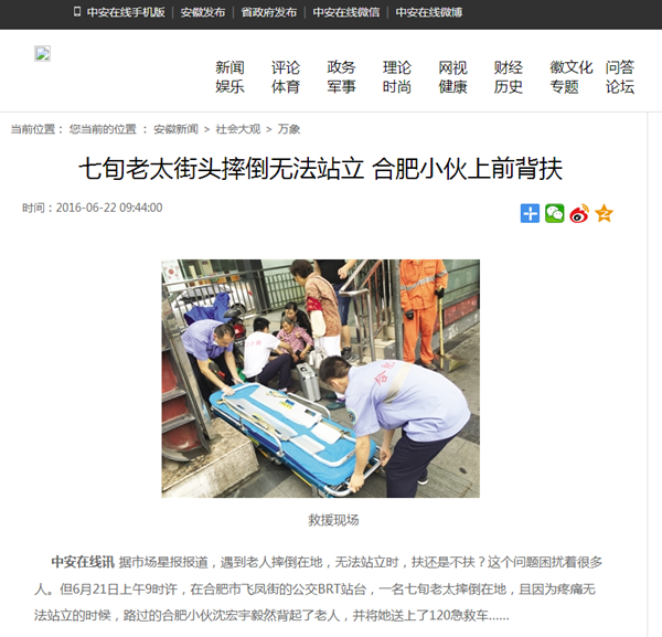 本网讯(王友雅)6月21日上午9时许,在合肥市飞凤街的公交BRT站台,一名七旬老太摔倒在地并因疼痛无法站立,我校信息工程学院学子沈宏宇路过,毅然背起了老人,并将她送上了120急救车。沈宏宇事后便要转身离开,老太的女儿激动地着拉住他,非要表示感谢,而沈宏宇称这是“义不容辞的事情。”