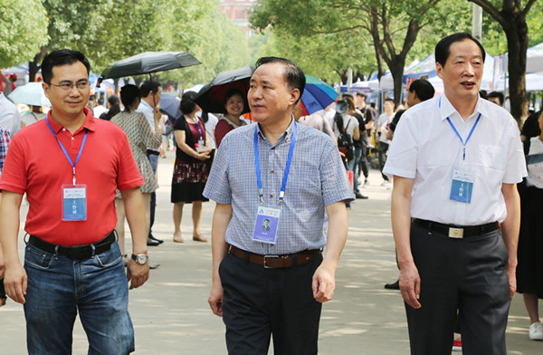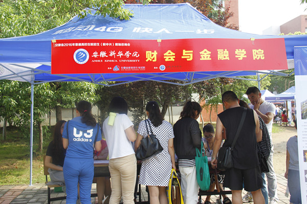 本网讯(王友雅,学生记者:苏雯雪、许馨元,摄影:陆如海、汪洋)6月26日上午,由安徽省教育招生考试院主办的安徽省2016年普通高校招生(皖中片)现场咨询会在我校举行,这是我校自2011年起连续承办的第6次高招咨询会。现场共有来自全国20多个省市的300余所高校的工作人员为考生和家长提供咨询服务,解答报考疑惑。安徽省教育招生考试院院长助理、普通高校招生处处长袁江林在新华集团副总裁、学校执行董事陆真,新华集团副总裁、学校监事会主席黄源,省督导专员、学校党委书记储国定和相关部门负责人的陪同下,亲临现场指导工作。