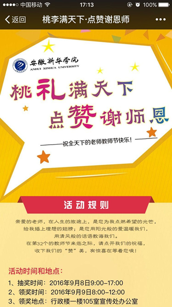 本网讯(通讯员:丁玮)在第三十二个教师节到来之际,校宣传处、学院办公室组织开展了“桃‘礼’满天下,点‘赞’谢师恩”官方微信点赞抽奖活动,不仅为辛勤工作的全体教职员工送去教师节祝福,更为大家准备了精美的节日礼物。
