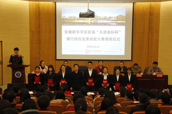 本网讯(通讯员:贾婷婷)我校首届“天源迪科杯”银行综合业务技能大赛于日前圆满落幕,12月23日下午,大赛颁奖典礼在学术报告厅举行。副校长马凤余,教务处副处长王士赵,合肥天源迪科金融服务中心总经理吴福全、综合部经理康维胜,财会与金融学院执行院长操宏华、副院长张衡,财会与金融学院全体教职工和获奖学生参加了颁奖仪式。仪式由财会与金融学院院长助理蔡冬梅主持。