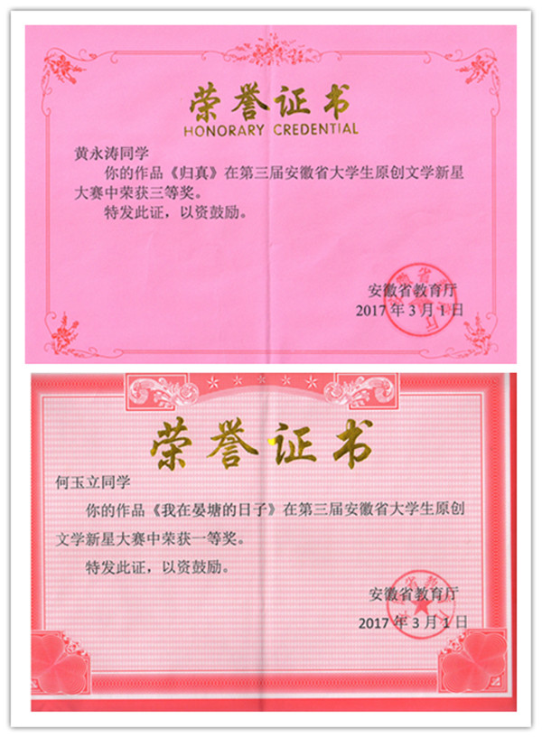 本网讯(学生记者:夏冬润)近日,从省教育厅传来喜讯,在2016年第三届安徽省大学生原创文学新星大赛中,我校文化与新闻传播学院2013级汉语言文学1班何玉立的作品《我在晏塘的日子》荣获一等奖,2016级汉语言文学本科1班黄永涛的作品《归真》荣获三等奖。