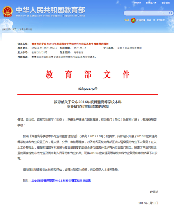 本网讯(通讯员:孙雁南)近日,教育部下发《教育部关于公布2016年度普通高等学校本科专业备案和审批结果的通知》(教高[2017]2号),我校申报的商务经济学(020105T)、会计学(120203K)、审计学(120207)、表演(130301)、艺术与科技(130509T)、互联网金融共6个本科专业获准设置。其中,互联网金融专业不仅是我校首次获批设置的国家目录外新专业,而且是国家首次同意设置的专业。