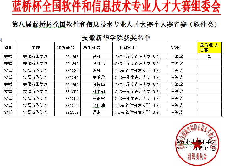 我校信息工程学院于2017年1月举办了安徽新华学院第四届程序设计大赛,从参赛的200名学生中遴选20名学生参加省赛赛前集训,指导团队由信息管理系主任徐梅担任组长,袁书萍、钱丽、胡俊、杨娟、陈平作为指导教师,经过四个多月训练,代表学校前去参加此次比赛。此次大赛既是对学校创新人才培养质量的检阅,更是学校教学改革成果的充分展现。信息工程学院一直坚持以赛促教、以赛促学,努力提升学生软件开发能力,进而向行业内输入具有创新实践能力的应用型人才,提高毕业生综合竞争力。
