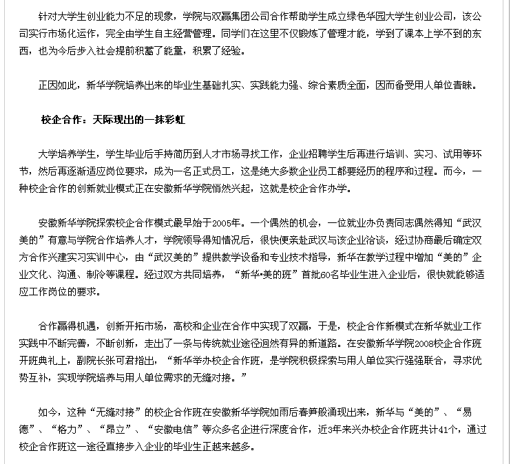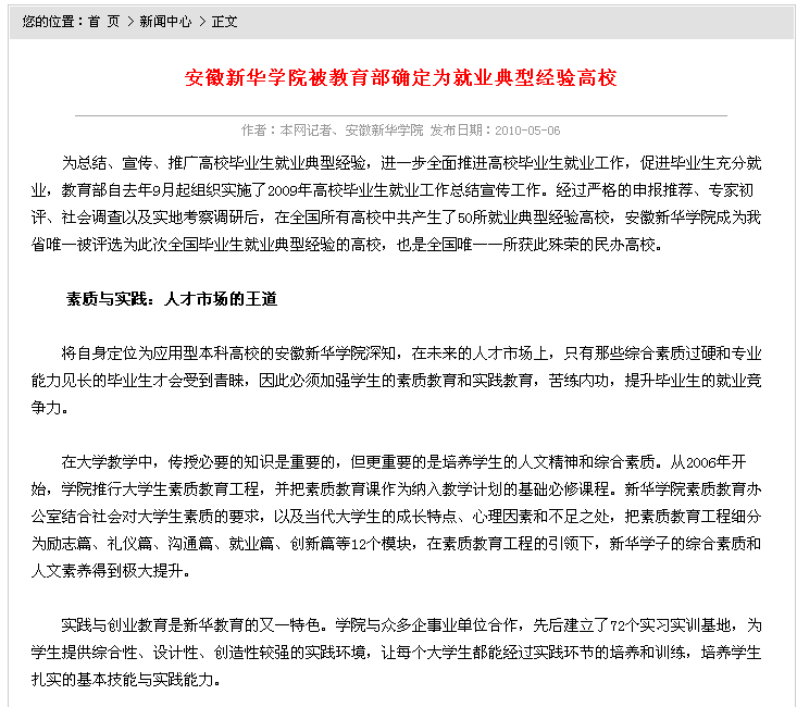2010年5月6日,安徽教育网在首页对我院入选全国就业典型经验高校一事进行了相关报道。