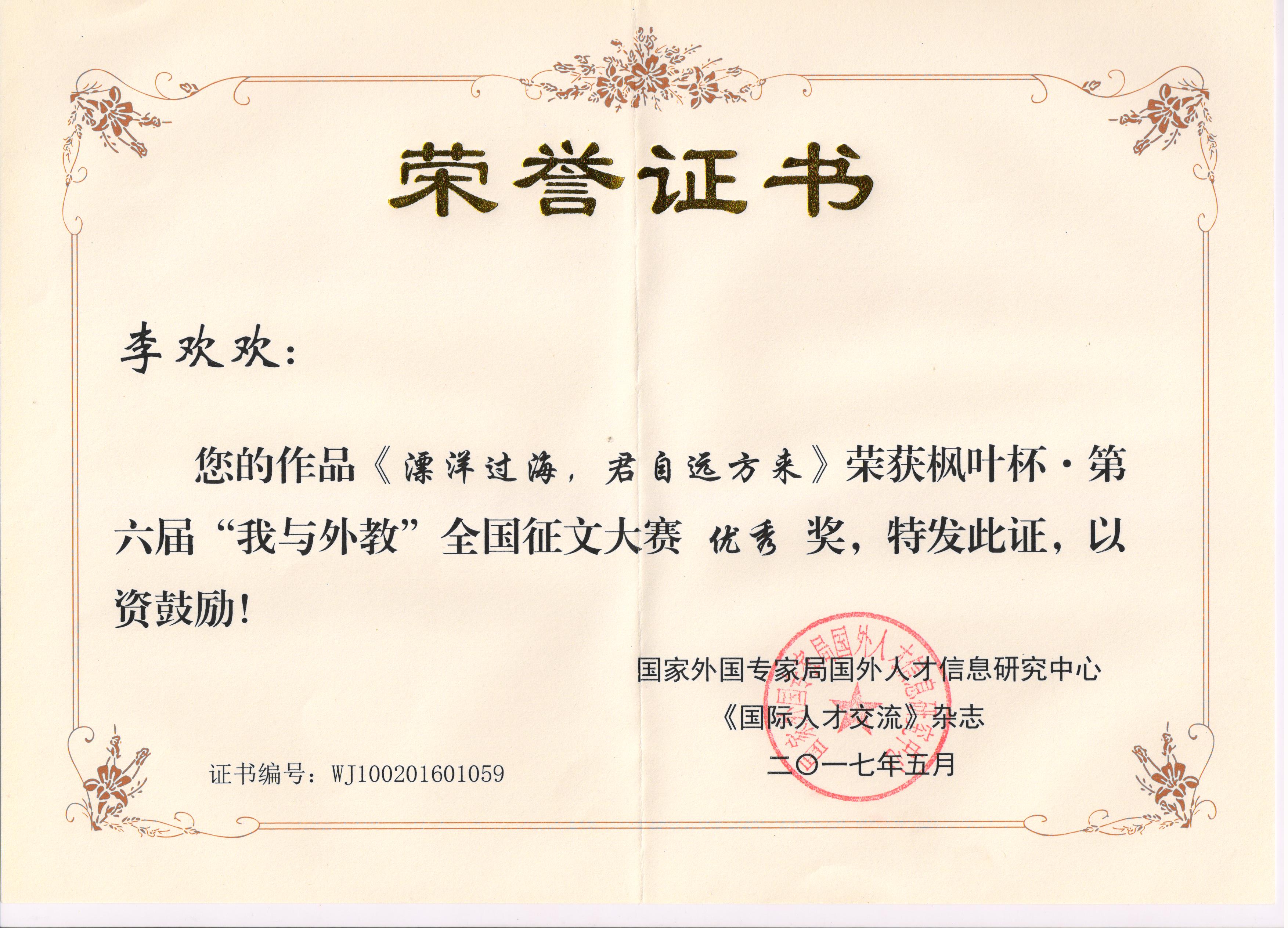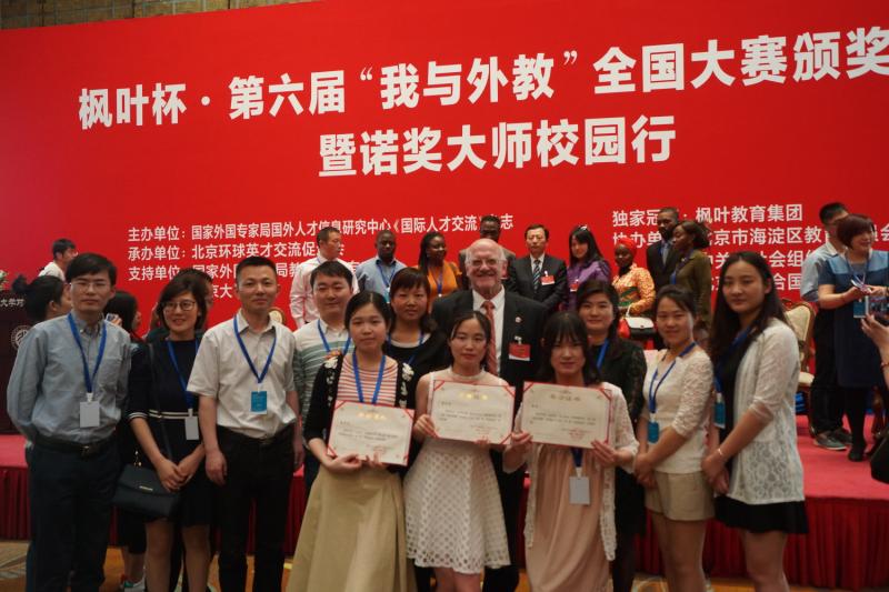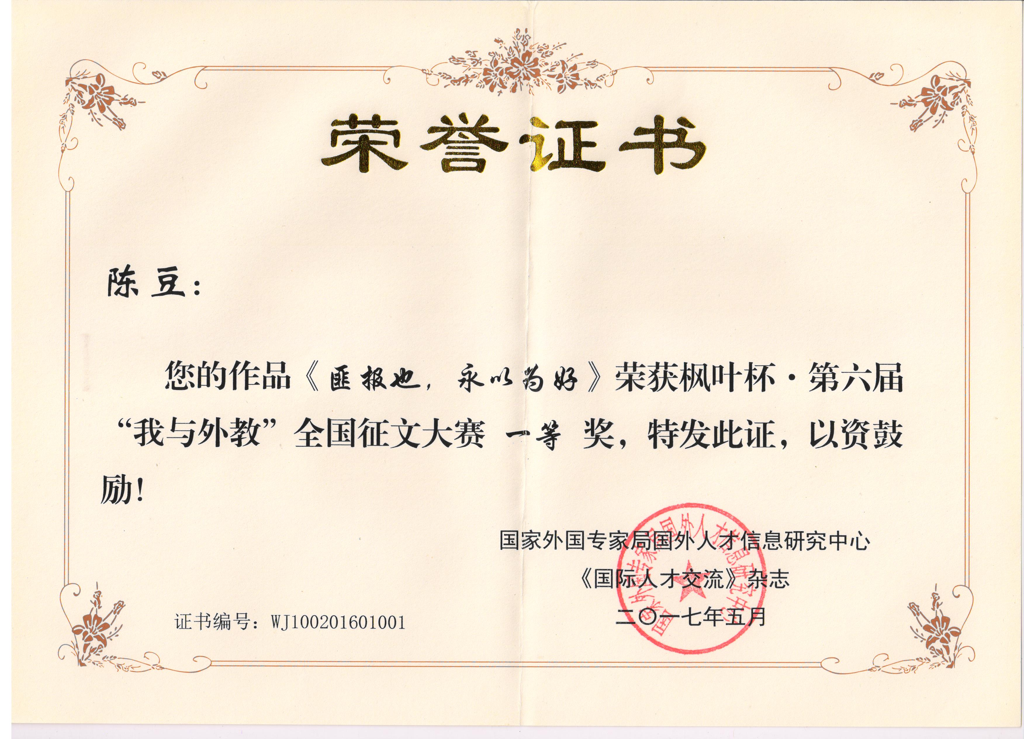 本网讯(通讯员:马兰、周晶 )5月13日,由国家外国专家局主办的“枫叶杯”2016“我与外教”全国征文大赛颁奖典礼在北京举行。我校外国语学院学子陈豆和李欢欢的作品在全国近六千余份作品中脱颖而出,分获全国一等奖和优秀奖。同时,我校获“全国优秀组织单位”称号。