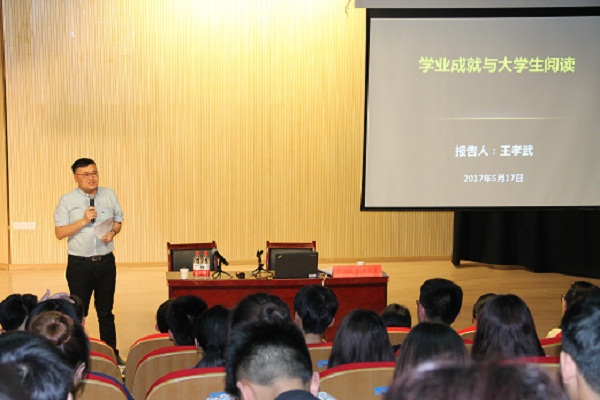 本网讯(通讯员:张欣)为营造“书香华园”,助力学生学业发展,5月17日下午,图书馆特邀校副董事长、党委副书记王孝武,在文化与新闻传播学院演播厅举办了一场题为“学业成就与大学生阅读”的学术报告。报告会由图书馆副馆长汤干君主持,学校相关专业的师生代表130余人参加了报告会。