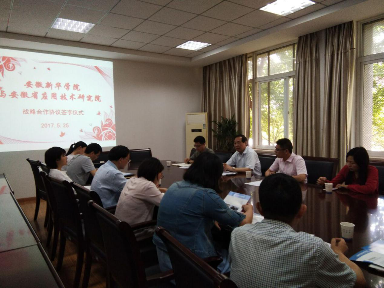 本网讯(通讯员:王娟、卫强)为深入开展应用型人才培养和应用型高水平大学建设,拓宽校所企合作的深度和广度,5月25日,我校与安徽省应用技术研究院签订战略合作协议,副校长杨世国、安徽省应用技术研究院副院长赵辉分别代表各自单位签订协议。会议由科研处副处长王琦进主持。药学院院长张国升和骨干教师参加会议。