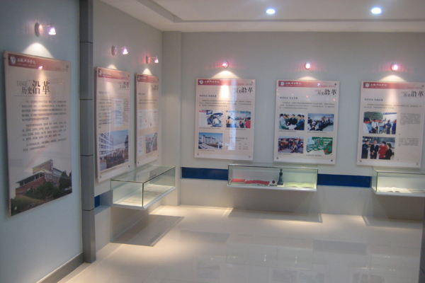 我院校史展览馆位于图书馆五楼,共有三间展室,第一间展室为胡锦涛总书记讲话节选、领导题字和主题墙;第二展室为“领导关怀篇”、“前言篇”和新华历史,展室内还展示了部分珍惜的历史实物;第三间展室为“今日新华篇”和“展望篇”,陈列柜上展出了我院获得的部分荣誉奖牌。校史展览馆内配有经严格训练的解说员。