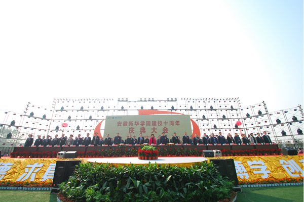 十年栉风沐雨,十年风华秋实。11月6日,安徽新华学院庆祝建校10周年庆典大会在祥云体育场隆重举行。安徽省人大副主任朱维芳、郭万清、安徽省副省长唐承沛、安徽省政协副主席王鹤龄出席庆典大会,安徽省委宣传部副部长黄传新、安徽省委统战部副部长操建华、安徽省政府副秘书长余华柱,安徽省政协常委、新华集团董事长吴俊保、安徽省发改委副主任余群、安徽省教育厅副厅长李和平、安徽省科技厅副厅长王洵、安徽省经济和信息化委员会副主任吴晓明、安徽省人力资源和社会保障厅副厅长林海、共青团安徽省委副书记王琦、徽商银行董事长王晓昕、安徽大学校长程桦、中国科技大学党委副书记鹿明、合肥工业大学党委副书记张效英、中国农业银行安徽省分行副行长程春峰、合肥市委常委、统战部部长张进、合肥市人大副主任郭超、合肥市副市长、安徽大学副校长吴春梅、合肥市高新区管委会主任李兵、合肥市公安局局长程翰、新华集团副董事长吴伟、督导专员、安徽新华学院党委书记方向明、安徽新华学院院长王成福等在主席台前排就座,应邀参加庆典大会的省市政府各部门负责人、各兄弟院校代表、合作企业代表、新华集团各单位负责人和安徽新华学院领导也在主席台就座。