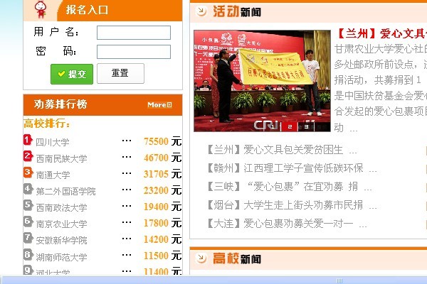 2011年3月,安徽省共有中国科技大学、合肥工业大学、安徽大学、安徽师范大学、安徽理工大学、安徽新华学院六所高校通过中国扶贫基金会审核授权开展爱心包裹劝募活动。目前,我院已开展第一批志愿者招募,共遴选了50名志愿者,并对其进行劝募培训。志愿者们利用节假日,在合肥市四牌楼邮局、大钟楼邮局、三孝口邮局、琥珀山庄邮局、安农大邮局五大邮局网点开展劝募活动。共计劝募100元学生型包裹142个,劝募资金达到14200元,在全国两百所参与高校中,排名第七名,成果显著。