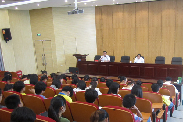 许春樵教授首先从20年前的“文学热”话题入手,为青年学子剖析了商业化背景下文学遭遇“边缘化”的现象:文学面临着影视剧和大众娱乐节目的冲击而淡出人们的视野,成为当代社会的一种尴尬存在。针对这一现象,许春樵教授结合自己多年的文学创作,重点为学子们论述了面对商业化、娱乐化和大众化的社会环境,文学创作者们的技术化努力:其一,积极与影视剧等视觉艺术寻求合作的空间,并在合作中坚守文学创作的人文关怀和精神阵地;其二,文学创作者应学习和了解文艺心理学和创作心理学的相关理论,并在创作中饰演多种角色,准确把握作品中人物的性格与情感,使得文学作品具有生动的情节、合理的叙事,在内容上具有可读性,最大限度地吸引读者的注意力;其三,在影视作品的冲击下,文学作品要想占有一席之地,还应在戏剧冲突的设计、叙事节奏的安排、细节的描写和人物对白的定型上狠下功夫,最大限度地贴近当代读者的阅读需要。在讲座中,许春樵先生还列举了龙一的《潜伏》、本•哈特的《朗读者》、哈代的《德伯家的苔丝》以及他自己创作的《放下武器》、《酒楼》等文学作品的成功案例,并结合对影视剧《集结号》、《你是我兄弟》、《乡村爱情》的分析,为同学们带来一场精彩的报告,虽户外夏日炎炎,但学术报告厅中却春意融融,学子们对许教授的精彩演讲感触很深,现场不时传来热烈的掌声。报告会结束后,许教授还与意犹未尽的师生进行现场互动。
