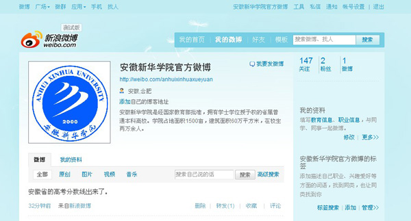 6月24日,安徽新华学院官方微博在新浪网正式注册开通,粉丝量正逐步增加。安徽新华学院作为在全国有影响力的民办本科高校,社会各界需要以直观的方式了解到学校的发展动态,官方微博的开通对于学校发布各类信息,增强与社会各界的交流、互动有着重要的作用和意义。
