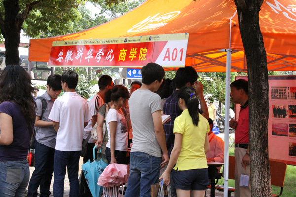 安徽新华学院校园内橙色的帐篷沿着校园环形路整齐排放着,各高校的招生展台装饰得很精致,纷纷把各校的亮点和优势展现出来吸引考生和家长。从全省各地市纷至沓来的考生和家长聚集在一张张展台前,仔细询问自己关心的问题。各高校的招生代表面对考生和家长的争相提问,都在耐心介绍本校的情况以及今年的招生政策,站在后面听的考生认真记录下报考院校的相关信息。