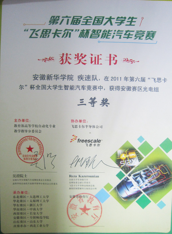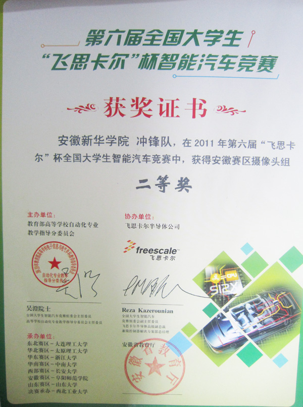 第六届全国大学生“飞思卡尔”杯智能车竞赛安徽赛区的比赛于7月15日到7月18日,在阜阳师范学院举行。电子通信工程学院学生代表安徽新华学院参赛,喜获1个二等奖,1个三等奖的佳绩。近日,参赛选手已经拿到了获奖证书。
