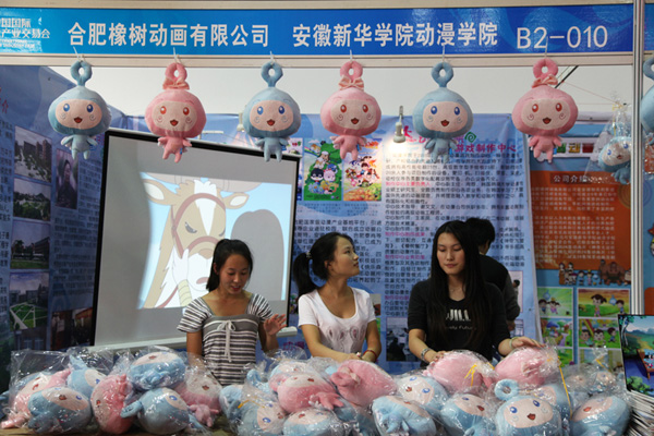 我校动漫学院及其校企合作单位合肥橡树动画有限公司带着共同合作完成的动画片《神奇大冒险》、《橡树餐厅》等作品参展并得到好评,其中《神奇大冒险》的衍生产品“咔咔”和“露露”在衍生产品馆进行展示时吸引了大批游客驻足观赏购买。衍生产品新颖的创意、独特的构思、可爱的外形为参展商带来了巨大的经济效益。
