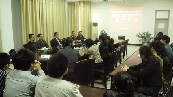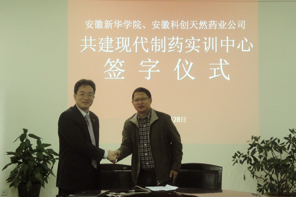 10月28日上午,安徽新华学院药学院与安徽科创天然药业公司共建“现代制药实训中心”签字仪式在安徽新华学院第二会议室隆重举行。安徽新华学院教学副院长马凤余教授、安徽科创天然药业公司董事长余世春教授、药学院院长张国升教授出席了签字仪式,药学院教师、学生代表共二十余人共同参加了签字仪式。