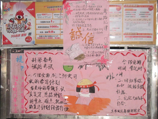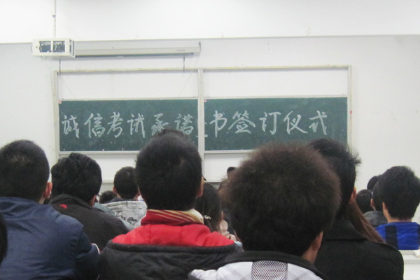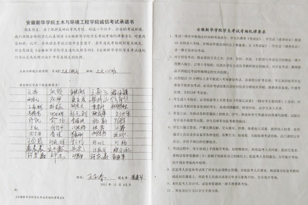 为此,土木与环境工程学院各班相继召开主题班会,开展诚信考试为主题的教育活动,将考前准备和考试诚信作为本月的板报主题在教室张贴;同时为了营造良好的考前氛围,土木与环境工程学院团总支、学生会和助理团等学生组织将考试要求和考前的复习方法通过漫画的形式告知每位同学。为了加强考纪教育,让每一位同学都熟悉考试流程和遵守考场纪律,本月初,全体在校生班级组织开展了诚信考试承诺活动,各班班长、团支部书记集中庄严宣誓承诺诚信考试。全体土木与环境工程学院的学生签订了《安徽新华学院土木与环境工程学院考试诚信承诺书》,并将承诺内容张贴在班级的宣传栏时时提醒。
