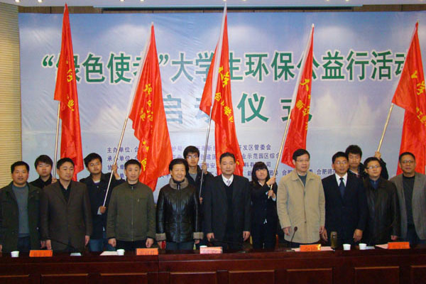 “绿色使者”大学生环保公益行活动启动仪式12月7日在我校举行,合肥师范学院同我校的“绿色使者”关注农村生态环境,调研农业农村面临的污染问题以及造成污染的原因,同时通过文字、图片等形式进行环保宣传,提高农村群众的环保、节水、护水意识。我校还与安徽农业大学、安徽建筑工程学院、合肥学院、合肥师范学院的环保大学生志愿者握指成拳,缔结环保联盟,以实际行动号召更多的人参与到环境保护中来,唤醒公众环保意识。多家媒体进行了跟踪报道。