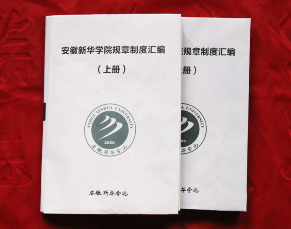 在集团公司的精心指导和全校各部门的共同努力下,经过近一年的编审、校对,《安徽新华学院规章制度汇编》于近日成功付印。规章制度印刷成册是我校制度建设中的大事,是我校在依法治校、规范管理方面取得的又一项重要成果,标志着我校向现代化大学建设方面又迈出了坚实的一步。