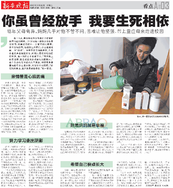 2月28日,中国十大晚报之一的《新安晚报》在AⅡ03版面用整版报道了我校陆一南同学“背起母亲上学”的感人事迹。