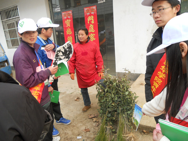 合肥市高新区城西桥村的街上除了往日的村民,还多了十几个头带白色的帽子,肩批红色绶带的一群大学生,他们就是我校青年志愿者协会环保社的成员。10 日早上,志愿者们在学校图书馆门前集合,由是多是第一次走进农村,他们都显得很兴奋和斗志昂扬。“昨晚我兴奋的一夜没睡!”同行的唐雪花等几个女生笑着说。志愿者为此次活动的准备从开始策划、制作调查表、准备教案等,忙碌却兴奋。负责人洪娜特地通知每个人自带水杯,绿色环保从自己做起。