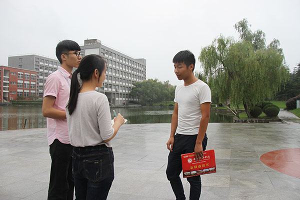作为华园宣传的主力军,记者团必然出现在采访的第一线。大学生记者团学生记者徐梦婷接到的采访任务是“迎新后勤工作”,上午8时,她穿梭在学校保卫处、食堂、宿舍公寓楼等场所之间。她说,大多采访对象态度热情,非常愿意配合采访工作,当然,由于迎新期间大家工作繁忙,也遇到过瓶颈。“碰到这样的情况我就一边在在心里不断地给自己加油打气,一边耐心地给被采访对象解释我们的工作。”在徐梦婷的努力下,后勤采访工作很快完成。“虽然天气不好,来回跑的很累,但只要想到自己是在为师生提供华园最新鲜的资讯,就觉得特别有意义,汗水都没有白流。”