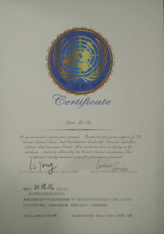 本网讯(赵彩虹) 近日,联合国“和平发展领袖网络暨‘一带一路’文化经济论坛”在维也纳联合国国际会议中心举行,此次论坛艺术展中,我校动漫学院教师江健龙的作品入选并被联合国收藏。