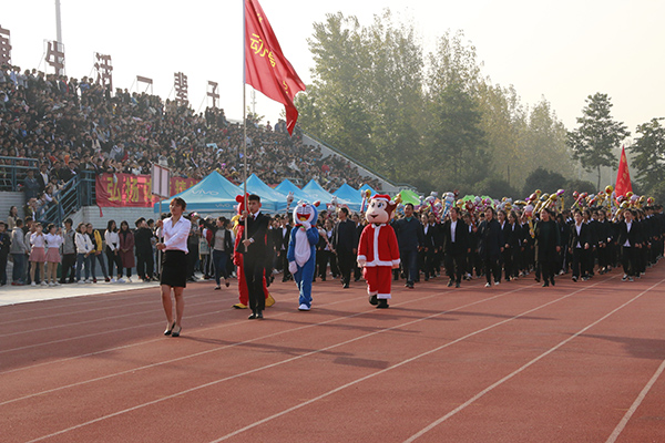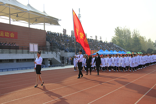 伴随着欢快、昂扬的运动员进行曲,护旗手高举国旗、校旗和本届运动会会旗,精神饱满地走过主席台。紧随其后的是各二级学院代表团,他们迈着整齐矫健的步伐,依次入场。