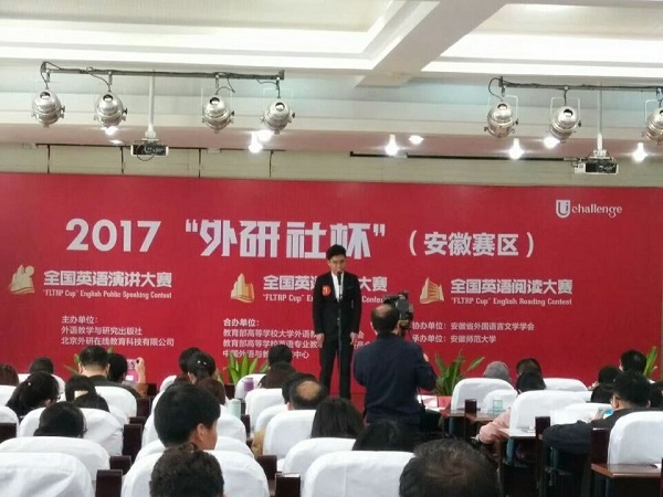据悉,2017“外研社”杯全国大学生英语写作、演讲、阅读比赛是由外语与教学研究出版社主办,教育部高等学校大学外语教学指导委员会、教育部高等学校英语专业教学指导委员会合办,安徽省大学外语教学研究会协办,安徽师范大学承办。