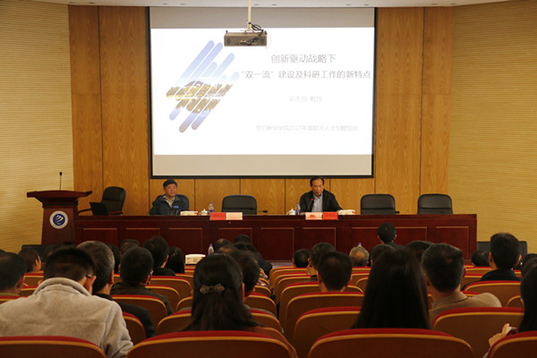 吴先良教授主要从国家创新驱动发展战略、“双一流”高校建设、如何做好高校科研工作三个方面展开讲座。吴教授旁征博引,运用典型的案例和自身长期的科研管理和科研工作经验总结,从高校、科研部门、二级学院和教师等四个层面,深入浅出的讲解了在“双一流”建设的背景下,如何做好科研工作。报告内容丰富,受到了广大教职工的热烈欢迎。
