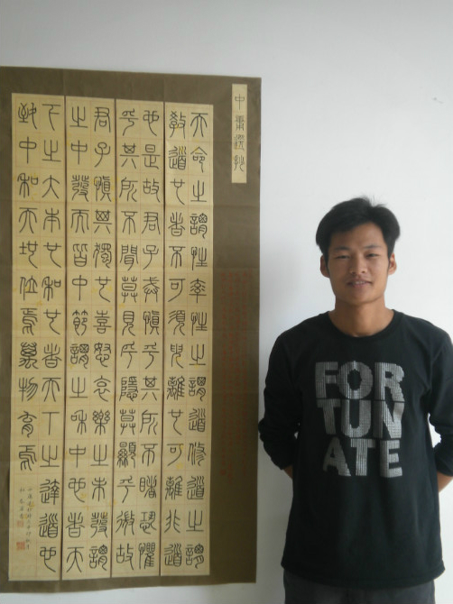 继我校方胜亮同学在全国第二届大学生艺术展演活动中获得了全国二等奖的佳绩后,杜春军在全国第三届大学生艺术展演活动中再创辉煌。从2011年10月份接到比赛通知,杜春军做了精心的准备,在选材、选纸笔、起稿一直到完成四尺的《中庸选抄》作品,一共用了半个月的时间。此次创作灵感源自于第三届大学生艺术展演活动的主题“青春•使命 ”,他认为《中庸》中的一些思想是当今大学生应该学习的。“感谢生命中过去现在亦或是将来的辛酸苦困,更感谢在此间给我教诲、帮助的人和事。”参赛过程中,书画协会指导老师江健龙、王维华给了杜春军很大的帮助,当谈及大学三年多来老师对于自己书法以及为人处世的教诲,杜春军十分感谢两位指导老师。