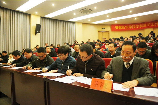 动员大会期间还举行了审核评估责任书签订仪式。校长石秀和代表学校与各二级学院、各单位、各部门主要负责人分别签订了《安徽新华学院本科教学工作审核评估责任书》。