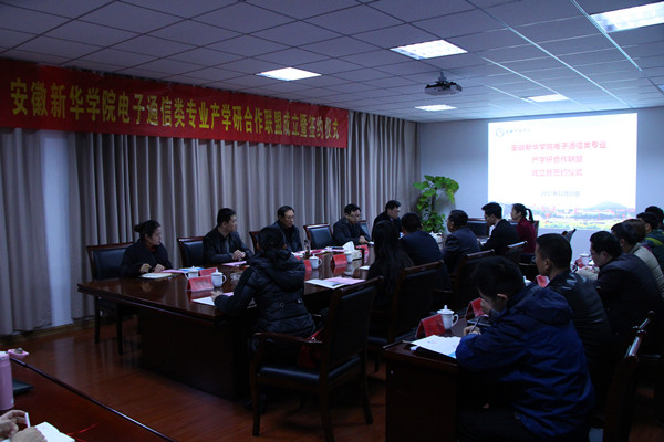 本网讯(通讯员:汪青)12月20日,安徽新华学院电子通信类专业产学研合作联盟成立仪式在第三会议室举行。副校长杨世国、安徽省电子学会秘书长王国庆、润健通信股份有限公司安徽公司总经理严从东、大唐移动通信设备有限公司区域市场总监陶思成、阳光电源股份有限公司人事经理孙巧、北京华信智原教育技术有限公司安徽分公司运营中心经理宋家言等相关企业代表、科研处副处长张帆、电子通信工程学院执行院长计勇、副院长吕翔、院长助理汪青以及部分师生代表参加了成立仪式。