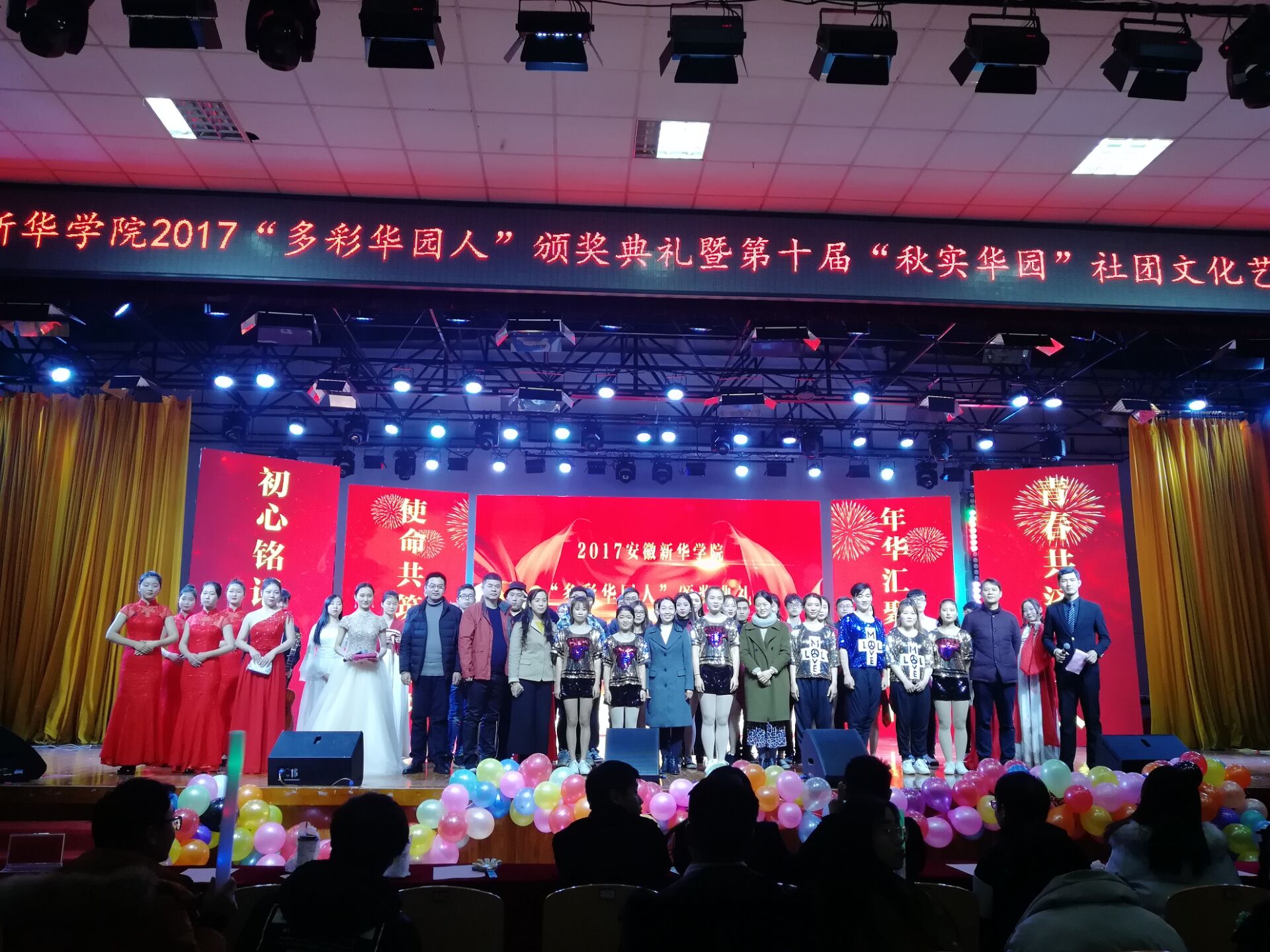 本网讯(通讯员:李孟媛)为表彰2017我校优秀学工队伍、学生社团以及优秀学子,发挥先进典型的模范带头作用。12月29日,校团委在大礼堂举办了安徽新华学院2017“多彩华园人”颁奖典礼暨“秋实华园”第十届社团文化艺术节闭幕式晚会。出席本次晚会的有副校长王丽、人事处处长黄君婕、院办主任盛晓青、保卫处兼产业处处长陈义盛、学生处处长汪俊东、教务处副处长孙成伟、学生处处长助理柯姗姗、校团委教师以及在肥高校学生组织代表和我校各学生社团代表。