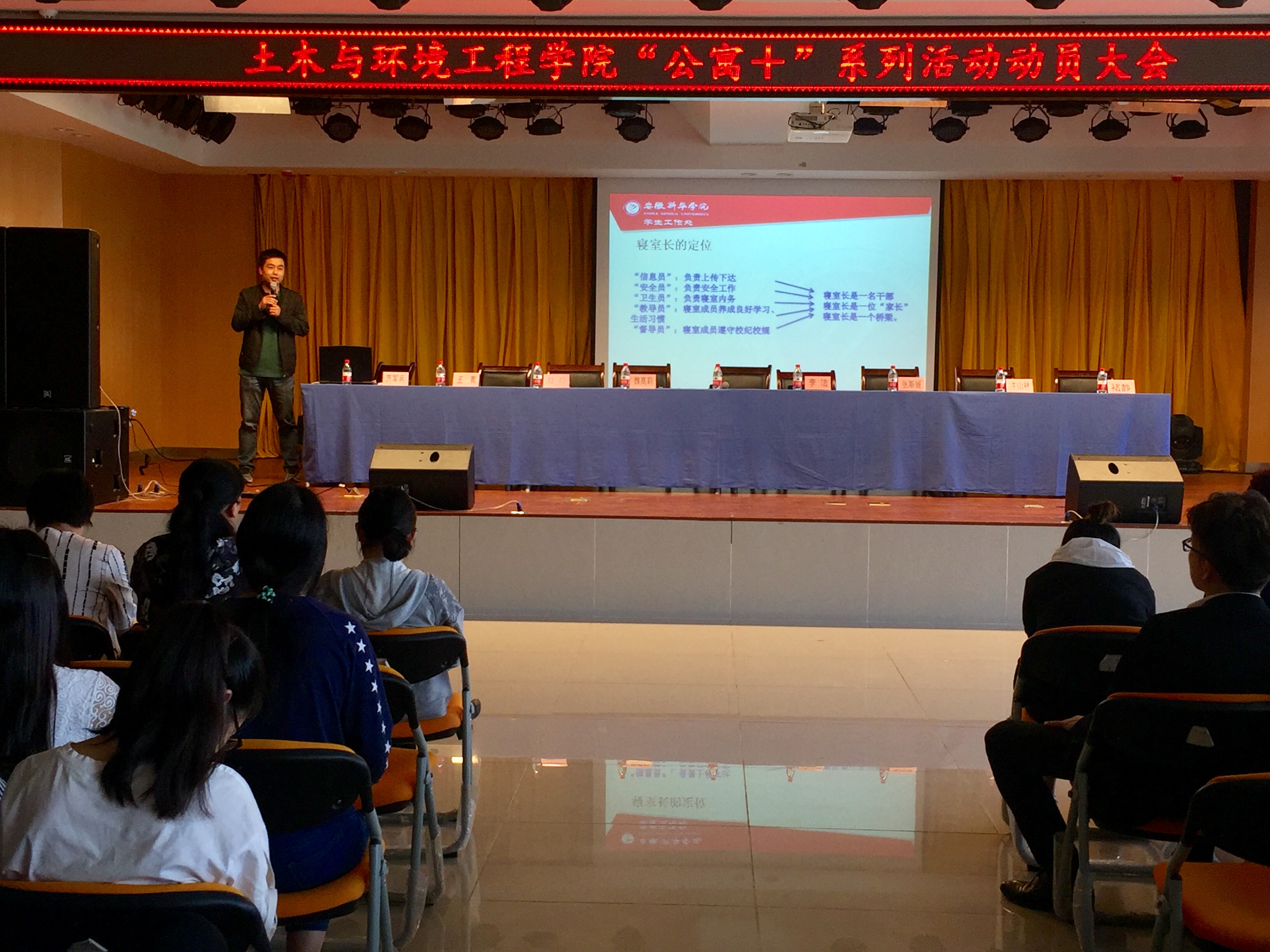 本网讯(通讯员:张心钰)为进一步丰富大学生寝室文化, 促进同学之间相互交流、理解、合作,创建积极向上、团结友爱的寝室文化氛围,5月10日中午,土木与环境工程学院在大学生活动中心小礼堂举办了以“特色示范寝室创建,党员结对进公寓”为主题的“公寓+”系列教育活动动员大会,安徽新华学院学生处处长助理齐军兵,土木与环境工程学院党总支副书记、副院长李洁,党总支组织委员、学管秘书魏高莉,党总支组织专员张斯媛、各学生支部书记、全体非毕业班班长、学生党员及寝室长代表参加此次会议。会议由李洁主持。