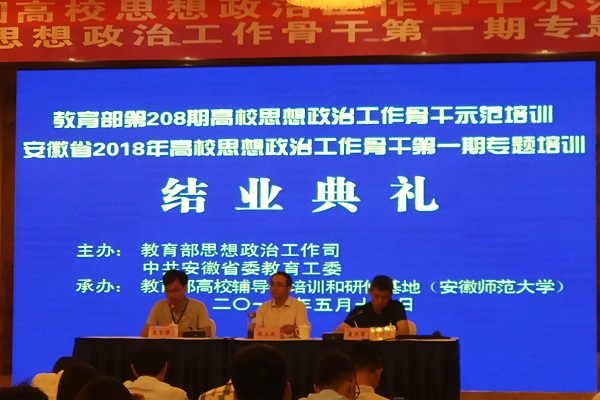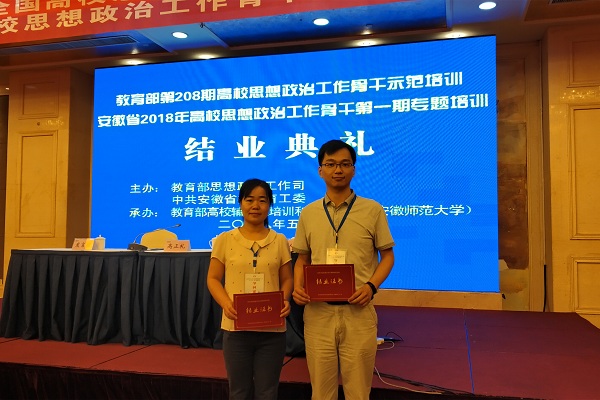 本网讯 (通讯员:周景、苏荣萍) 为深入学习宣传贯彻落实习近平新时代中国特色社会主义思想和党的十九大精神,把全国全省高校思想政治工作会议精神贯彻落实引向深入,进一步提高高校思想政治工作骨干的综合素质和能力水平,根据《高校思想政治工作质量提升工程实施纲要》《普通高等学校辅导员队伍建设规定》和《安徽省高等学校辅导员培训计划(2016-2020年)》要求,教育部高校辅导员培训和研修基地(安徽师范大学)于5月16日至5月18日举办教育部第208期高校思想政治工作骨干示范培训暨安徽省2018年高校思想政治工作骨干第一期专题培训。本次会议共有近300名全国高校代表参加,外国语学院副院长周景、财会与金融学院辅导员苏荣萍代表我校参会。