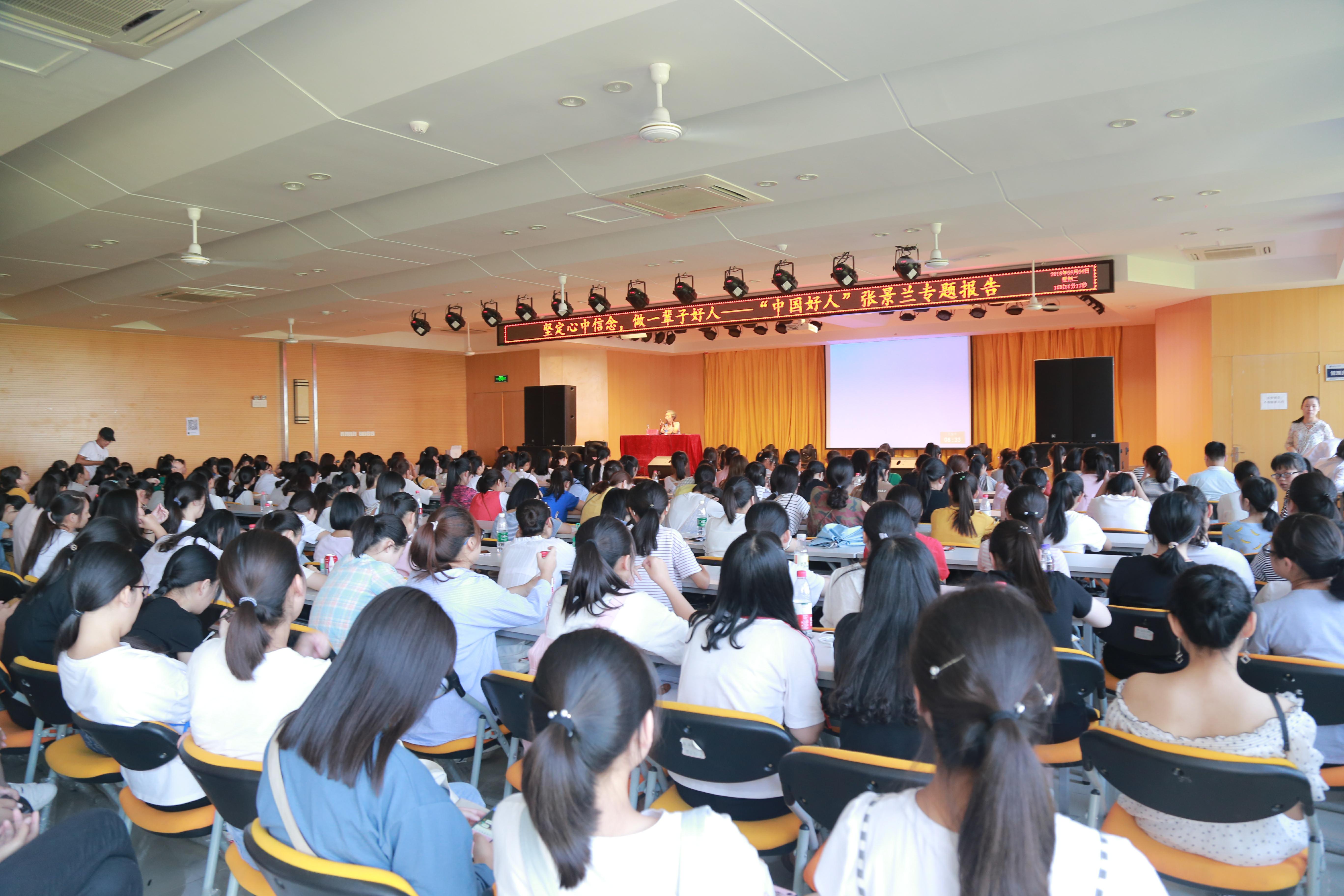 本网讯(通讯员:王娟 摄影:王琳)9月4日下午,由我校外国语学院组织承办的新生入学教育系列活动之“中国好人张景兰高校公益演讲”在学校小礼堂举行。本次演讲活动由外国语学院执行院长邵玲主持,外国语学院2018级全体新生及辅导员参加了本次活动。