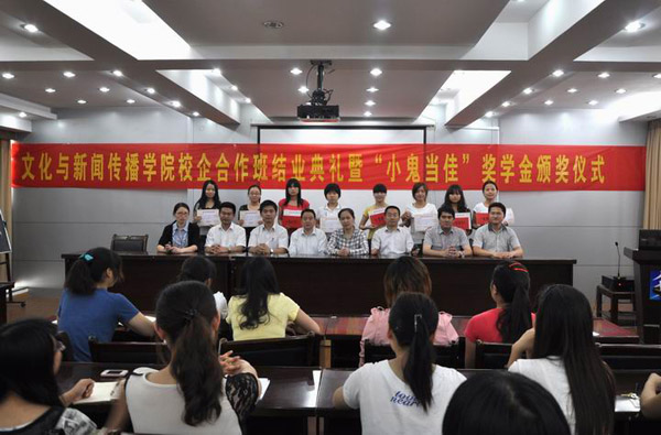 5月23日中午,文化与新闻传播学院校企合作“小鬼当佳”班结业典礼暨奖学金颁奖仪式在图书馆六楼管理学院举行。来自我校文化与新闻传播学院和继续教育学院八位同学获得2012年度“小鬼当佳奖学金”。