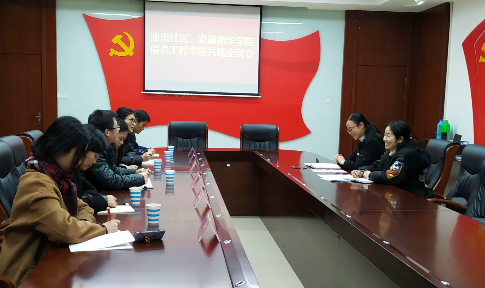 本网讯(通讯员:叶承琼)12月25日下午,信息工程学院党总支一行6人来到共驻共建单位高新区油墩社区党总支,就标准化建设工作交流、校区联合志愿者服务、等工作进行座谈。社区党总支第二支部书记李林,总支宣传委员李霞两位同志参与了座谈会。