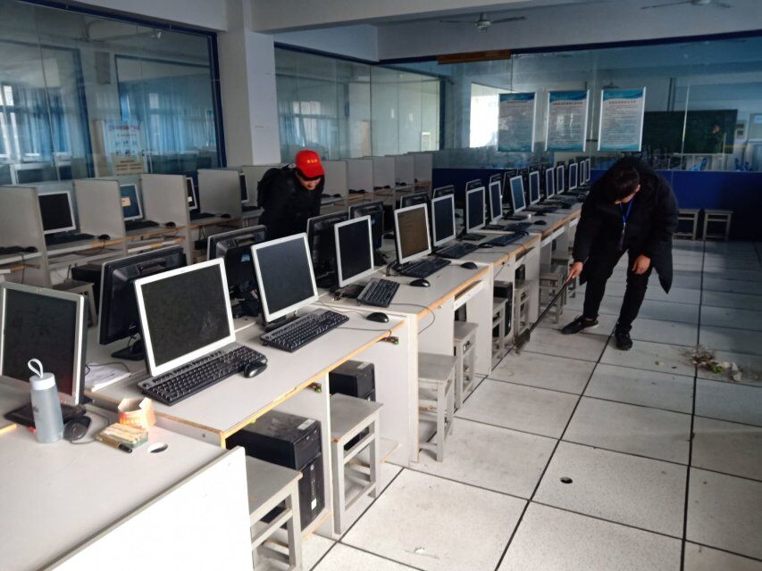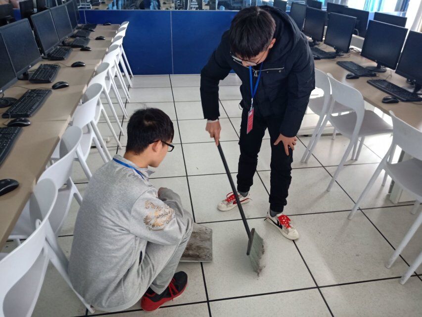 活动共分为3个小组,由各组组长带队分别对四楼、五楼、六楼的19间机房进行清洁,清洁对象主要针对地面及桌椅夹缝死角的垃圾打扫清除;桌面、显示器、主机表面浮灰用抹布清扫;各机房静电地区性板主过道用半湿的拖把把地一遍;各个窗户的沿边周围,全程由班委和老师进行监督和检查。清洁过程中,志愿者们齐心协力,认真负责的对机房里的各个角落,机箱前后进行了打扫,经过志愿者们的努力,机房焕然一新。