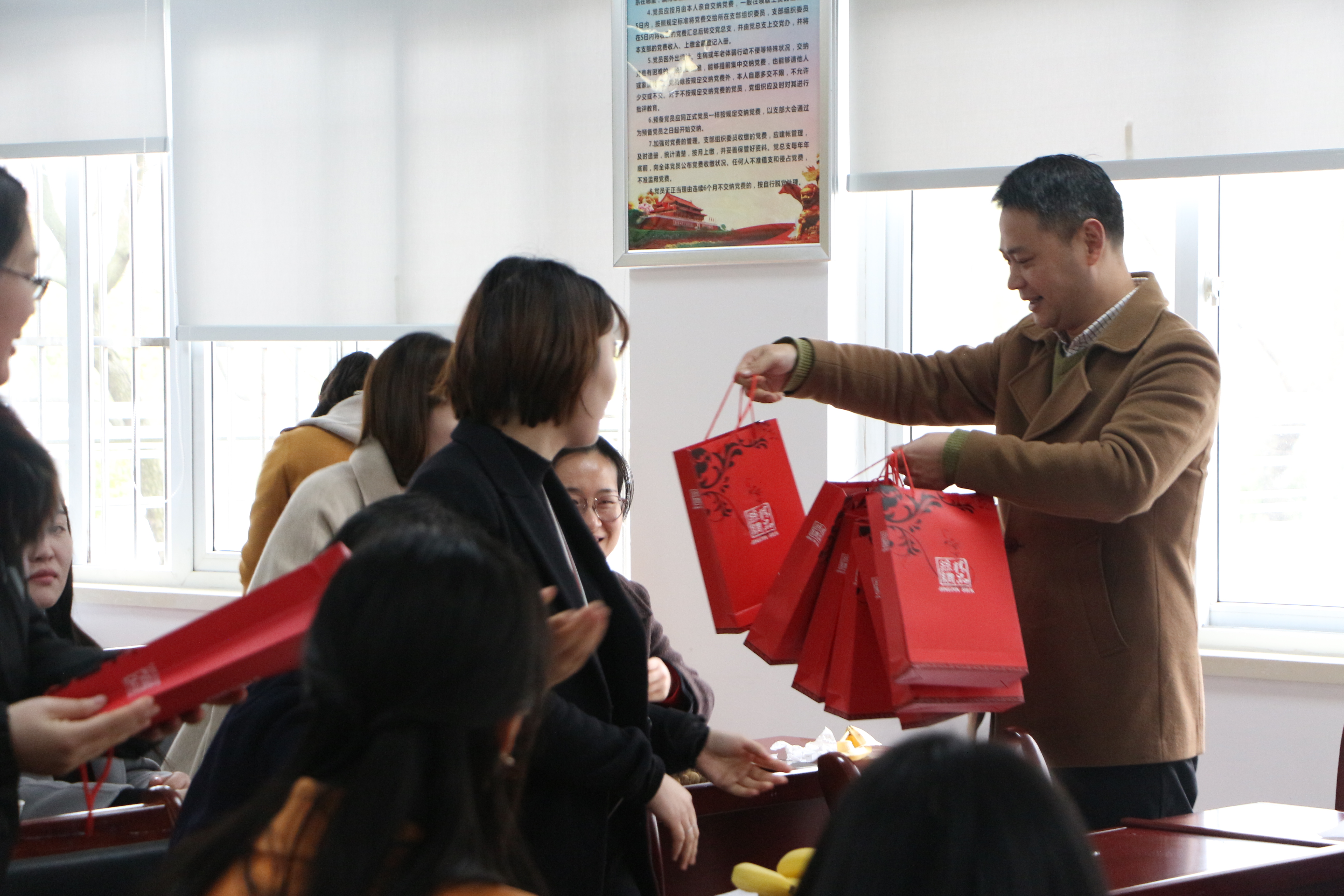 茶话会上汪俊东代表财会与金融学院给全体女性教职工送上节日的祝福,肯定了大家过去一年在岗位上的付出。他希望大家继续带头弘扬进取精神,提升职业素养,立足岗位实干,展示时代女性的新风采,作出时代女性的新贡献。汪俊东还亲自为大家献上节日的礼物,祝福大家在明媚的春天里绽放美丽自我。