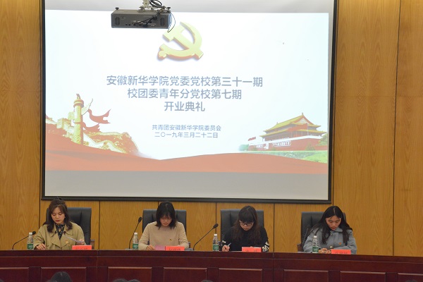 本网讯(通讯员:杨雨婷)为适应新形势下党员发展工作需要,充分发挥党组织在人才培养与教育管理等方面的重要作用,3月25日午,安徽新华学院党委党校校团委青年分党校第七期入党积极分子培训班开班典礼于学术报告厅举行。参加本次典礼的有学工直属党支部书记校团委书记柯姗姗、学工直属党支部纪律委员凌晨、学工直属党支部宣传委员校团委青年党校班主任杨雨婷、学工直属党支部组织委员张婷婷以及校团委青年党校第七期入党积极分子学员。