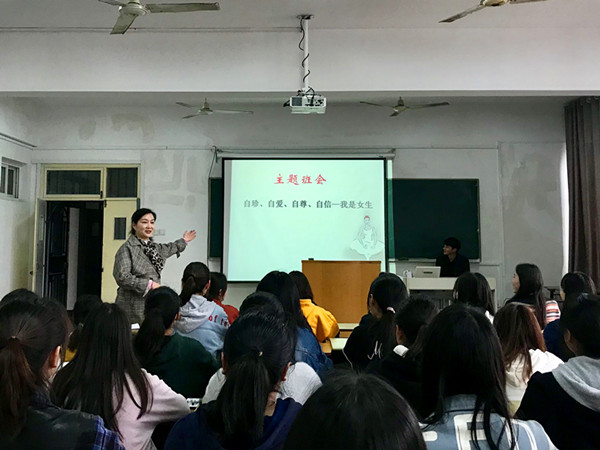 辅导员余静老师本次班会的序幕,她借助多媒体的形式,让同学们观看了一段成功女性演讲及生平介绍的视频,帮助学生体会自尊自爱自强在女性身上展现的魅力。随后,部分学生代表从身边案例及自身经历发表感言,从文明交往、自我保护、女性发展等方面引发班级讨论,进一步告诫同学们一定要提高自我防护意识和能力,懂得自尊自爱自强。最后,杨可同学朗诵了《做灵魂有香气的女子》。